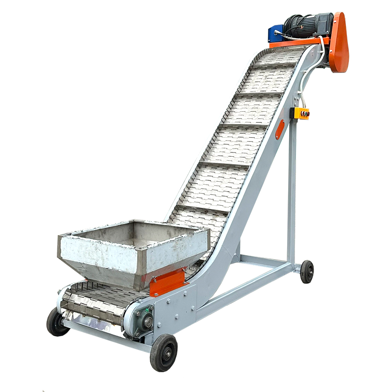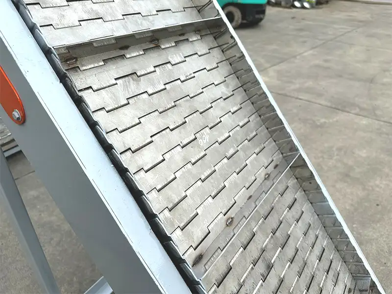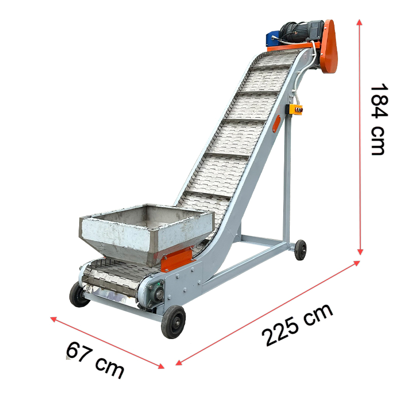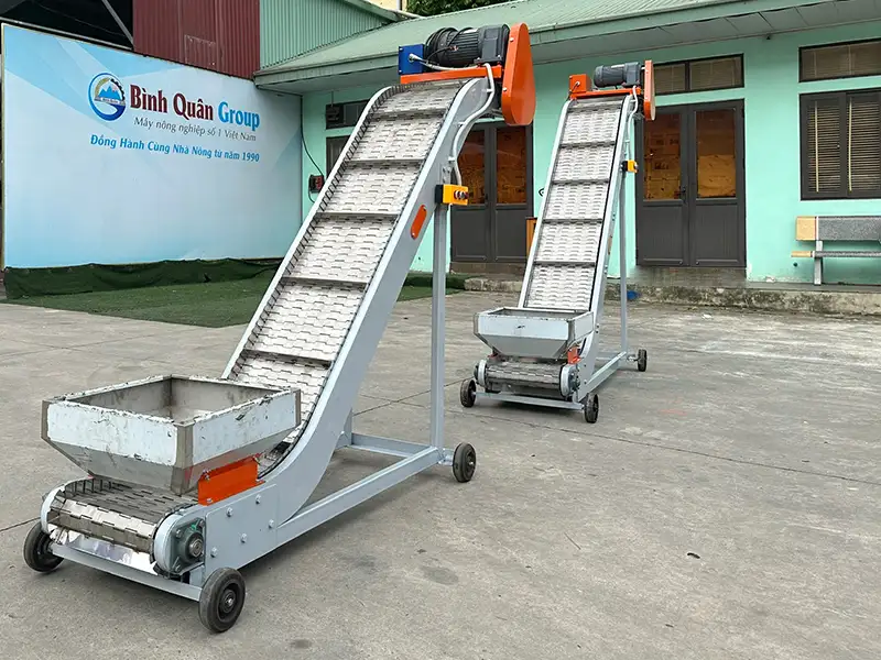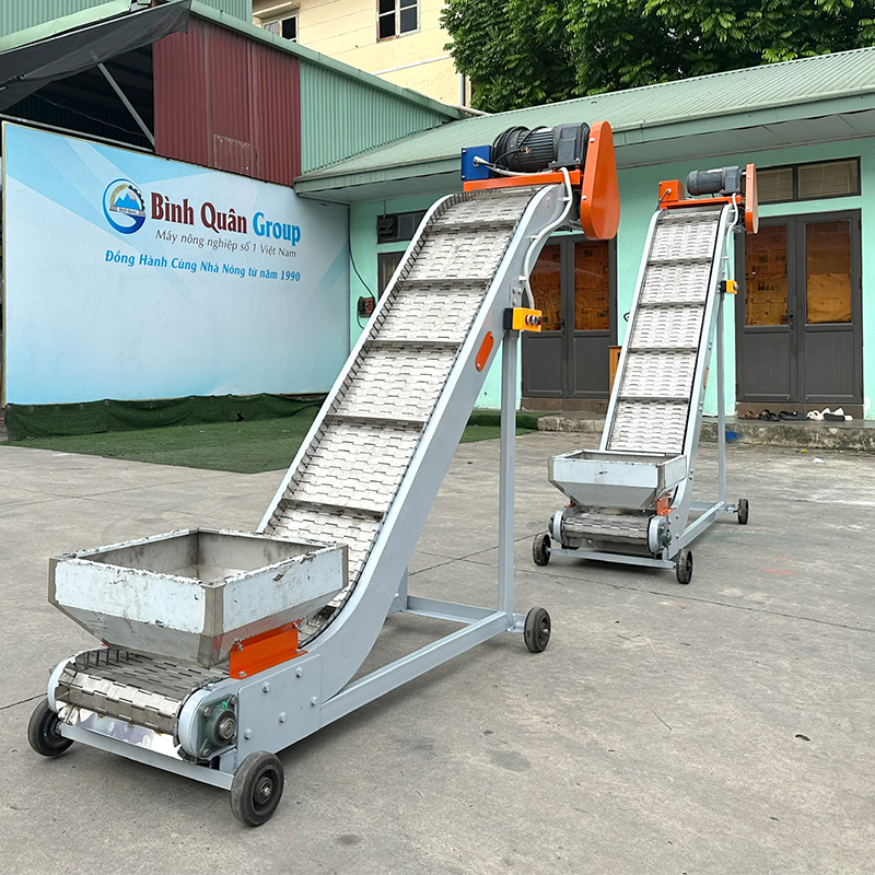 Băng tải bản lề nghiêng có khả năng vận chuyển các loại nguyên liệu thô như ngũ cốc, cám viên, dược liệu.. từ vị trí thấp lên vị trí cao một cách hiệu quả