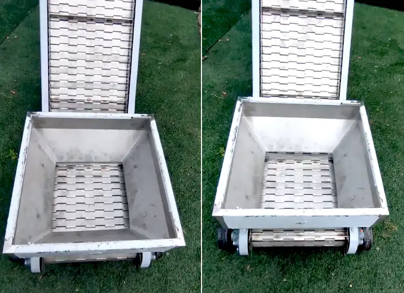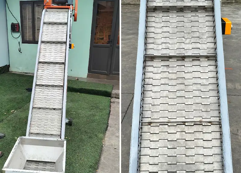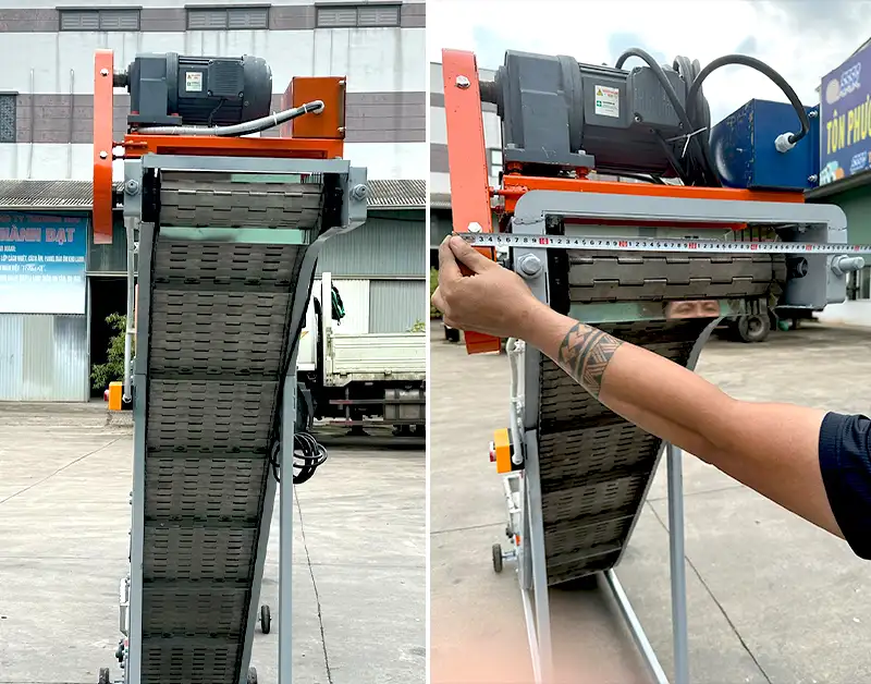 Trên bề mặt băng tải kết hợp với các thanh ngang tạo thành các khoang chứa nhất định, giúp nguyên liệu không rơi ra ngoài