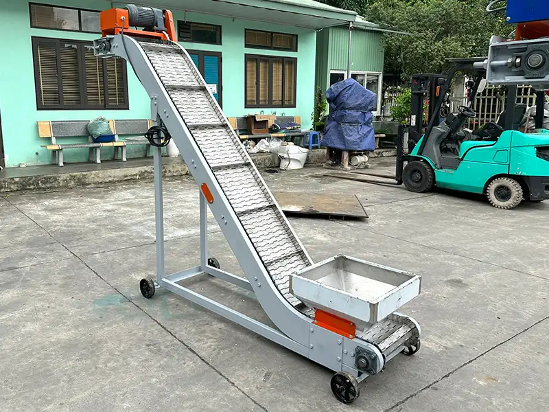 Băng tải bản lề nghiêng có khả năng vận chuyển các loại nguyên liệu thô như hạt đỗ, hạt đậu tương, cám viên.. từ vị trí thấp lên vị trí cao một cách hiệu quả