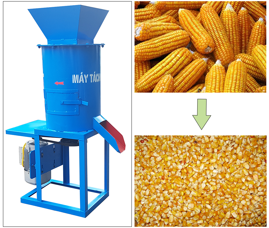 - Tính năng: Máy có chức năng tách hạt ra khỏi lõi nhanh, sạch mày. Hạt ngô không bị dập nát, lõi ngô không bị gãy.
