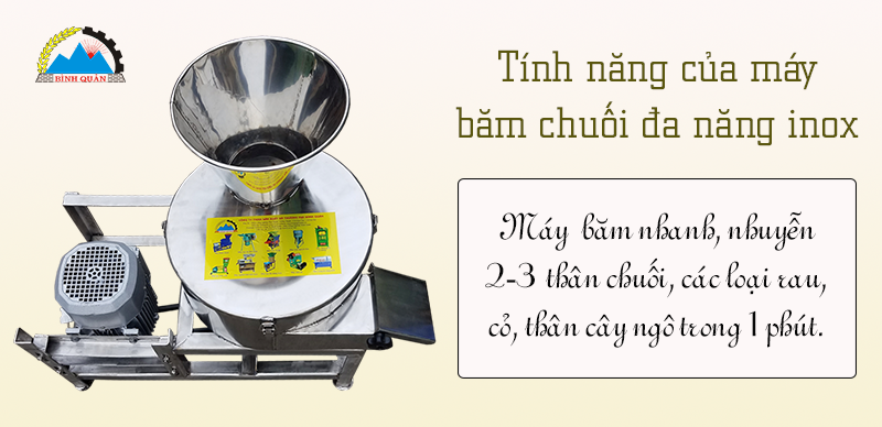 Máy băm chuối đa năng inox là một trong những sản phẩm ưu việt của Công Ty Bình Quân, được chế tạo và cải tiến mới mẻ, tiện ích, dùng để băm nhanh, nhuyễn thân chuối, thân ngô, các loại rau bèo, cỏ voi, làm thức ăn chăn nuôi cho gia súc, gia cầm.