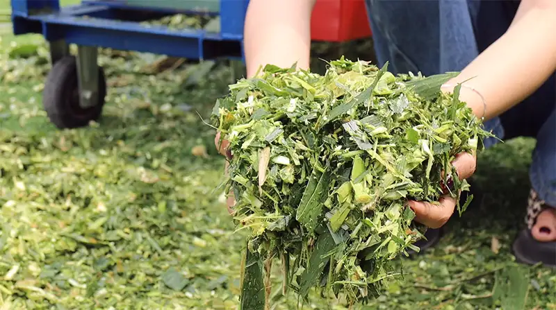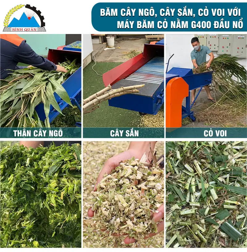 Quá trình băm tự động máy có khả năng đập dập và băm nhỏ các loại cỏ như cỏ voi, thân cây ngô, cỏ sả.. làm thức ăn cho gia súc.