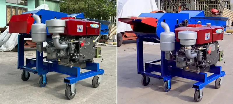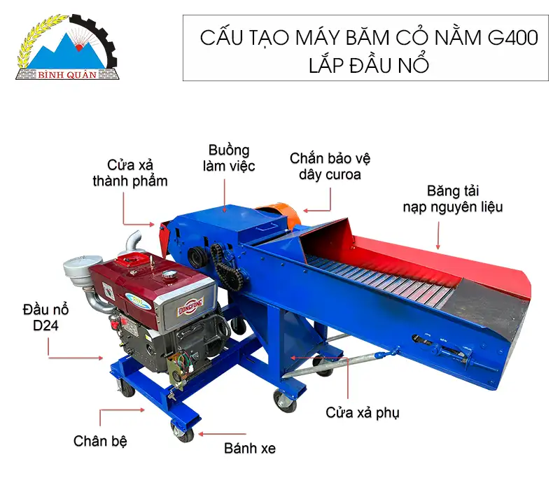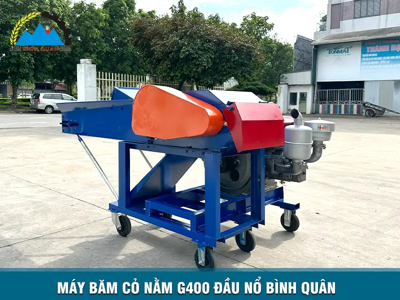 Máy băm cỏ nằm G400 phiên bản lắp đầu nổ do công ty Bình Quân sản xuất - thiết bị hỗ trợ bà con băm nhỏ các loại nguyên liệu dạng cỏ làm thức ăn cho gia súc - gia cầm với năng suất 3 - 4 tấn/giờ được các chỉ trang trại ưa dùng