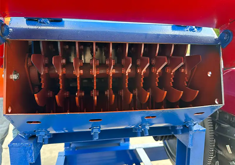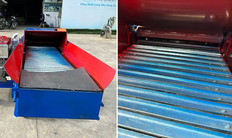 Máy băm cỏ có băng tải, nguyên liệu khi được đưa lên băng tải sẽ tự động quấn vào buồng băm
