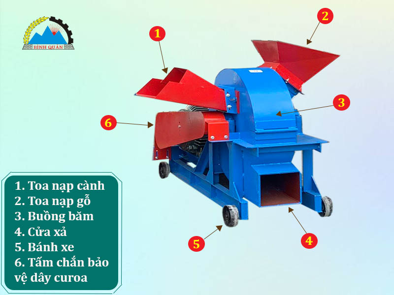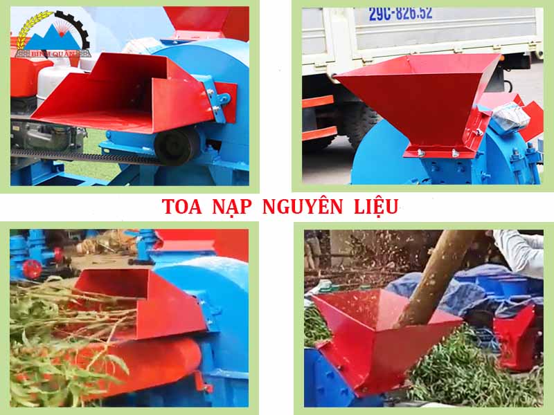 Máy được thiết kế 2 cửa nạp tùy vào loại nguyên liệu: Một cửa băm thân cây gỗ lớn; Một cửa băm cành cây nhỏ, cùi dừa khô, các đốt gỗ vụn.