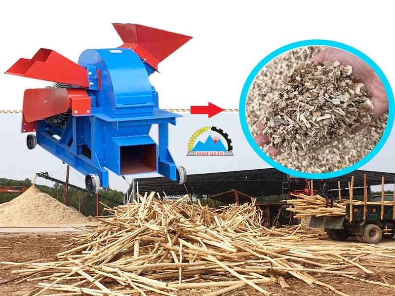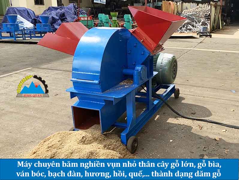Tính năng: Băm nghiền vụn nhỏ thân cây gỗ lớn, gỗ bìa, ván bóc, bạch đàn, hương, hồi, quế,... thành dạng dăm gỗ, phục vụ cho việc chế biến sản xuất gỗ ép, chất đốt,...
