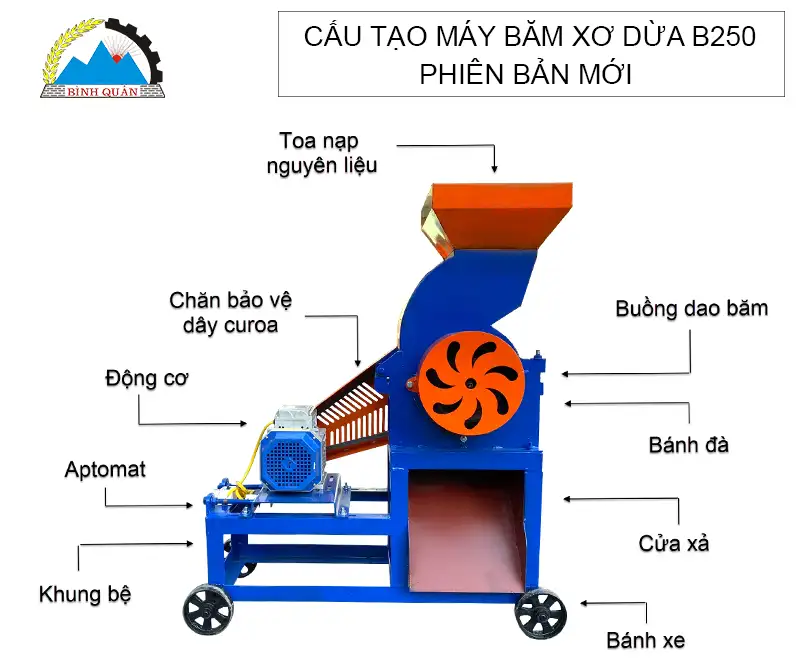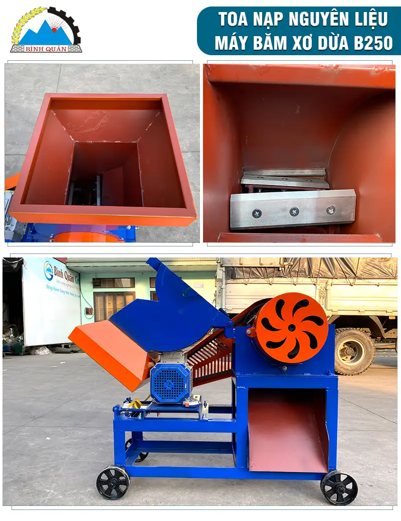 Máy băm xơ dừa B250 do công ty Bình Quân sản xuất chuyên dùng băm vỏ dừa khô, vỏ dừa tươi thành dạng mùn số lượng lớn