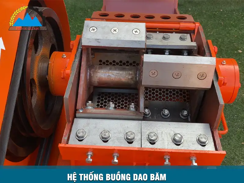 - 6 dao băm chính gắn trên trục quay hoạt động băm nghiền nhỏ nguyên liệu đến khi vừa với lỗ sàng lắp bên dưỡi và thoát ra ngoài