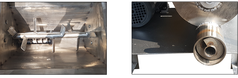 Máy được chế tạo hoàn toàn bằng inox chống dính, chống gỉ, cho thành phẩm thơm, đảm bảo vệ sinh an toàn thực phẩm. Khi máy vận hành, trục quay chuyển động dưới tác động lực của động cơ qua bộ nhông xích. Các cánh trộn làm việc cuộn, đảo đều nguyên liệu. Trục xoắn có nhiệm vụ, đẩy, ép nguyên liệu đưa ra xửa xả.