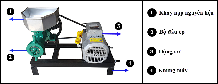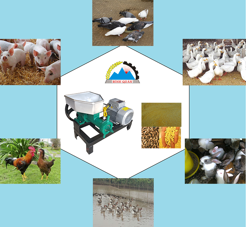 - Tính năng: Máy đùn các loại bột cám thành viên cám chăn nuôi. Máy chạy động cơ 3kW, chạy điện 220V, cho năng suất 25-40kg/h.