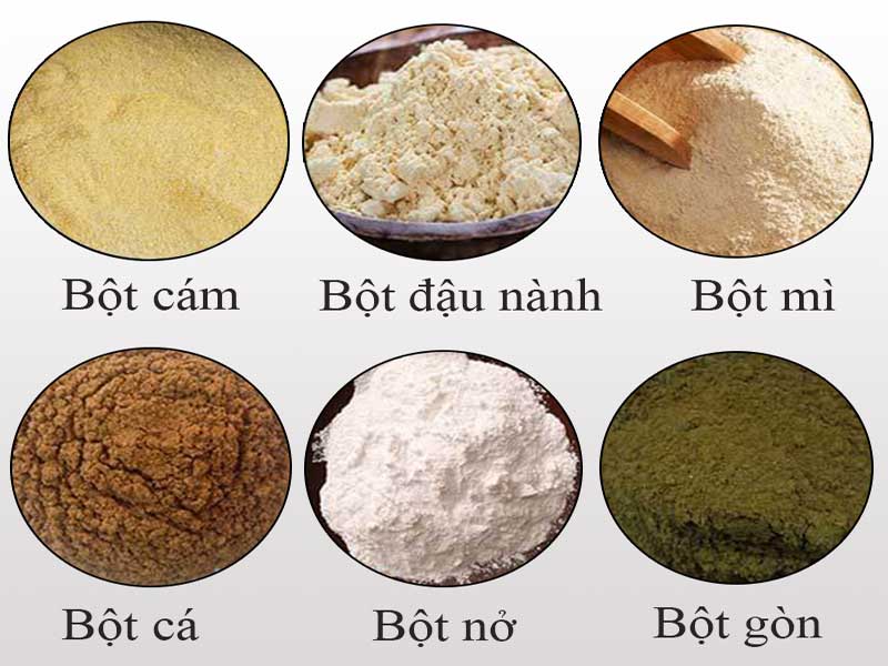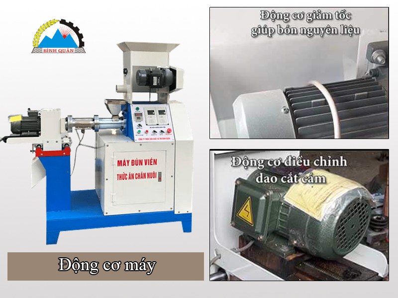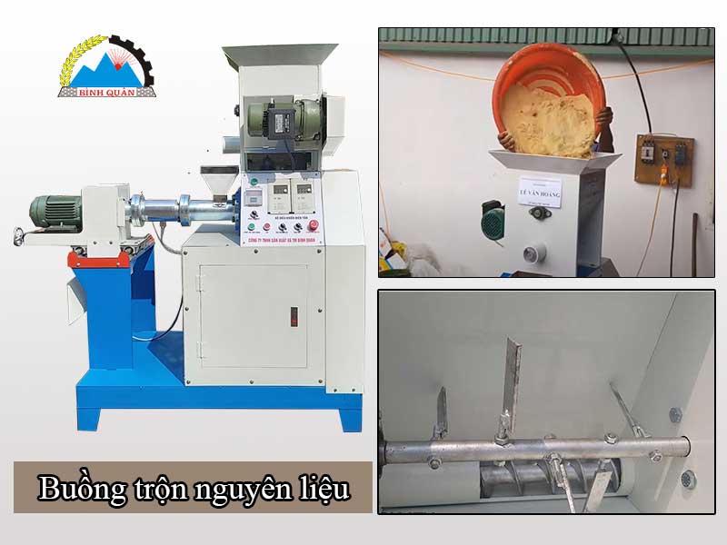 - Máy đùn viên thức ăn chăn nuôi Bình Quân nguyên liệu ép có phần hạn chế hơn chủ yếu là dạng bột khô như: Bột mỳ; bột cám; bột đậu nành; bột gòn; bột cá; bột nở... với tỷ lệ nhất định.