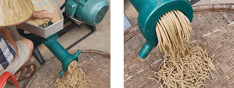 Bước 3: Cắm điện, cho nguyên liệu vào máng nạp, điều chỉnh lượng cám chảy xuống khoang ép.