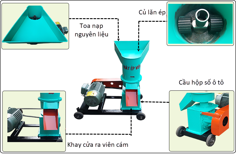 Buồng làm việc được cấu tạo mặt sàng và 2 củ lăn ép có nhiệm vụ ma sát nghiền – ép mọi đa dạng nhiều loại nguyên liệu như: ngô nguyên hạt, ốc, cua, cá, rau, cỏ, bột cám ngô, bột cám khoai,… và nhiều loại nguyên liệu khác, đường kính của buồng làm việc 24cm.