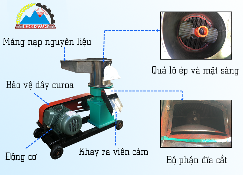 Bà con có thể thay đổi kích cỡ và độ dài ngắn của viên cám bằng cách lắp mặt sàng (3 ly,4 ly,5 ly) và điều chỉnh đĩa cắt. (Lưu ý: Trong máy lắp sẵn 1 mặt sàng, bà con có thể mua thêm các mặt sàng khác nhau phù hợp).