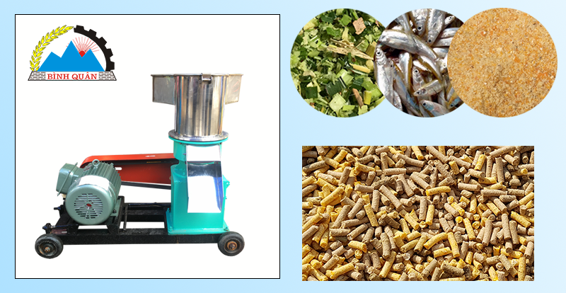 - Máy nghiền – trộn – ép các nguyên liệu thô, chưa qua sơ chế. Viên cám ép ra không bị bở, vỡ, có độ kết dính cao.