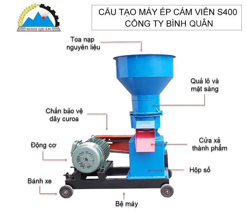 Máy ép cám viên S400 thuộc dòng máy chế biến thức ăn chăn nuôi của Công ty Bình Quân sản xuất.