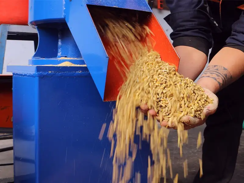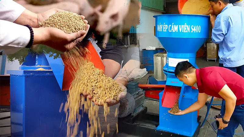 - Quá trình máy làm việc sinh nhiệt, cám ép ra có thể cho vật nuôi ăn ngay.