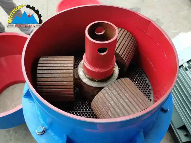 Dưới sự truyền lực của motor có công suất 30-37 kW và dòng điện 380V, quả lô của máy quay tròn quanh trục, nghiền – ép nguyên liệu, đẩy hỗn hợp xuống khay cửa ra qua các lỗ sàng.