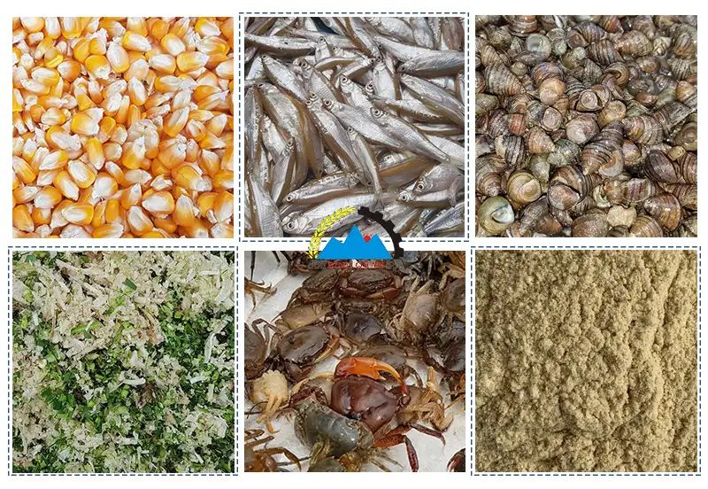Nghiền ép đa dạng các loại bột cám, rau, cua, ốc, cá, ngô, đậu đỗ nguyên hạt thành viên cám, cho năng suất cao, khoảng 800-1000 kg/h.