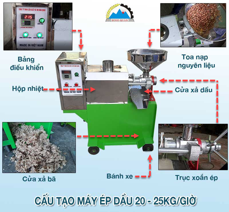 Máy ép dầu đa năng do công ty Bình Quân trực tiếp sản xuất chuyên dùng để ép các loại hạt chứa dầu như đậu phộng ( lạc); vừng ( hạt mè), hạnh nhân... làm dầu ăn sạch ngay tại nhà.