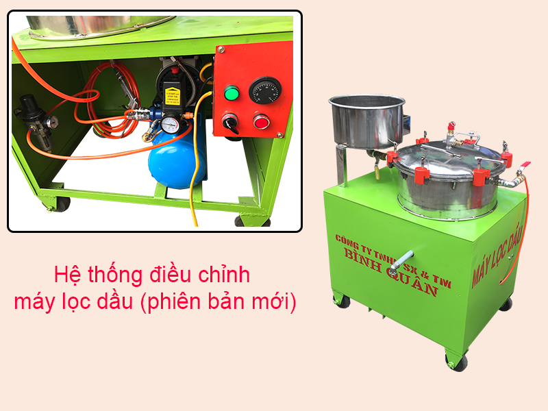 Bình bơm hơi có nhiệm vụ gia tăng áp suất, nén khí, tạo lực đẩy lưu lượng dầu xuống buồng lọc. Ở tại đây, buồng lọc sẽ có vải lọc dầu chuyên dụng, sàng lọc bằng inox có tác dụng lọc bỏ những tạp chất thu lại thành phẩm dầu trong, vô cùng chất lượng. Để lượng dầu có thể chảy ra ngoài và đóng chai người dùng điều chỉnh từ từ tay khóa xả thành phẩm dầu.