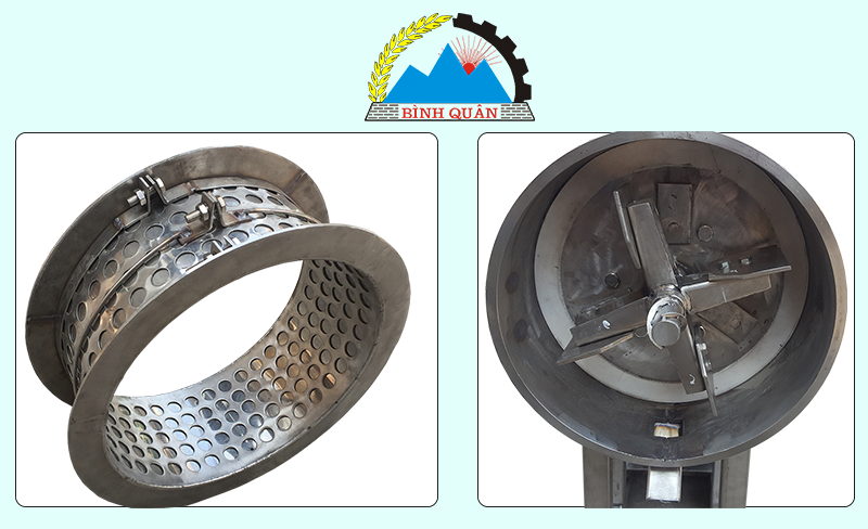 Hệ thống búa đập cánh quạt có nhiệm vụ nghiền gạo, đỗ thành bột siêu mịn. Tại đây, khi động cơ hoạt động truyền chuyển động đến trục xoắn làm cánh quạt quay tạo nên va đập chà sát nguyên liệu với thành máy. Nhờ vậy mà gạo, đỗ được vỡ vụn thành nhiều mảnh nhỏ đến khi mịn và hoàn toàn lọt hết qua lưới sàng.