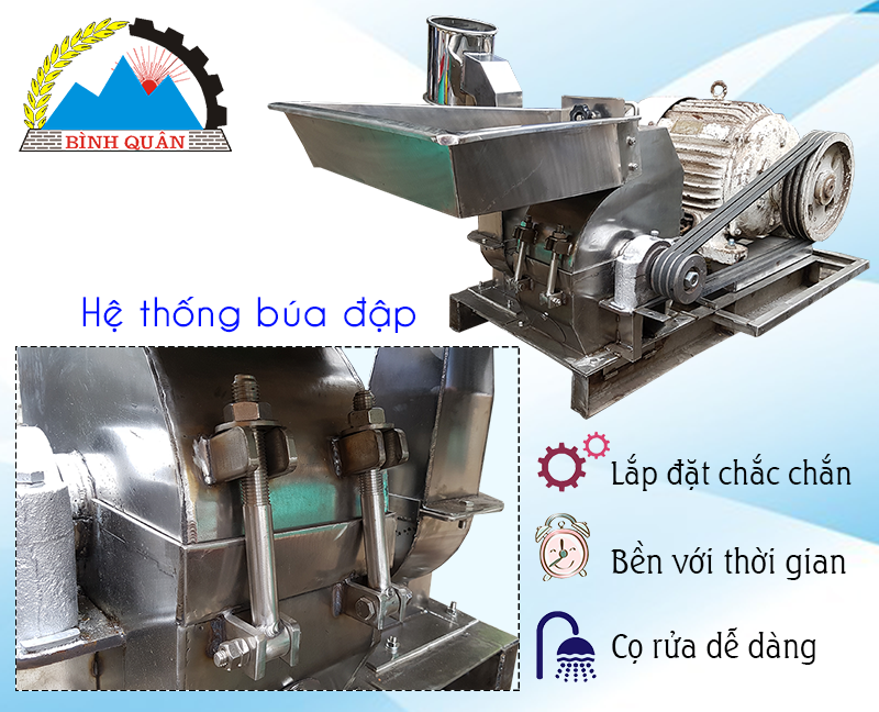 Đặc biệt, máy được trang bị hệ thống cánh quạt, bố trí trên cùng một trục với búa đập có nhiệm vụ hút và đẩy hạt bột được nghiền mịn đi ra túi vải.