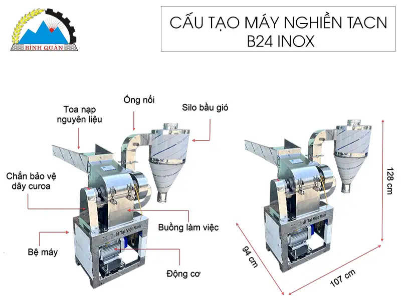 Máy nghiền Bi24 được thiết kế gồm 5 bộ phận chính: buồng nghiền, động cơ, toa nạp liệu, ống nối và silo bầu gió. Sự kết hợp tạo nên sự tiện lợi cho người dùng