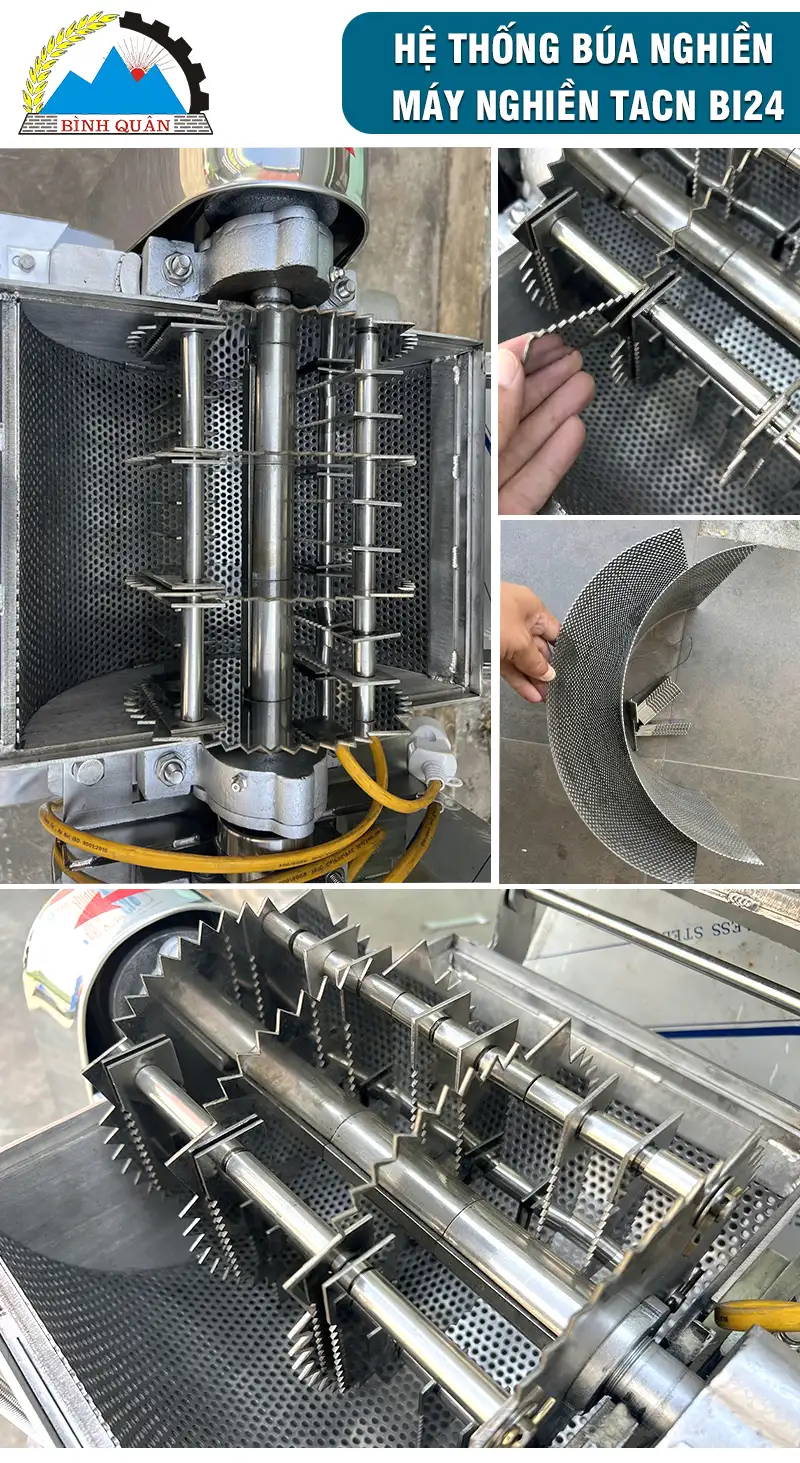 Bên trong máy nghiền được thiết kế gồm 24 búa nghiền chuyển động kết hợp với 4 đĩa đà và 9 búa cố định làm nhiệm vụ đập vỡ và nghiền nguyên liệu với mặt sàng đến khi bột đạt chuẩn sẽ qua lỗ sàng thoát ra ngoài