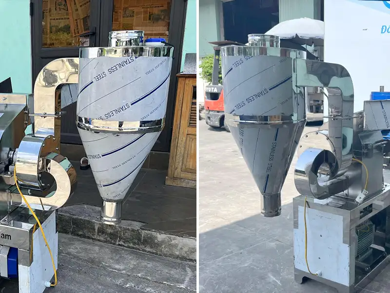 Thành phẩm sau khi nghiền sẽ được dẫn qua ống nối dẫn lên bầu hút gió. Quá trình giúp thu gom toàn bộ thành phẩm hạn chế tình trạng bụi hay thất thoát nguyên liệu