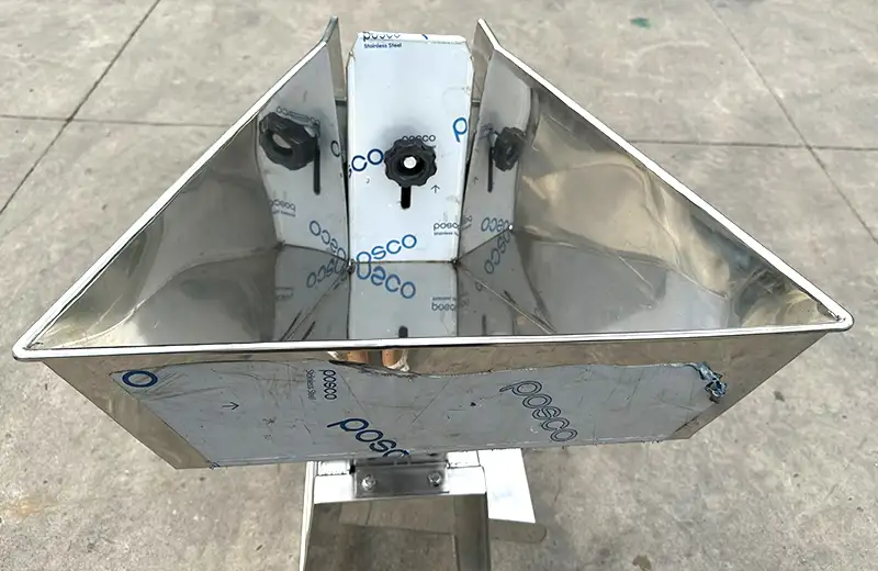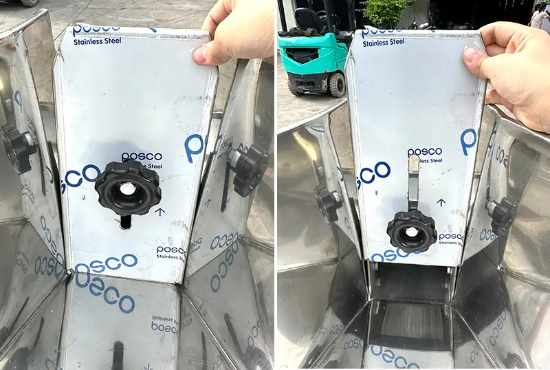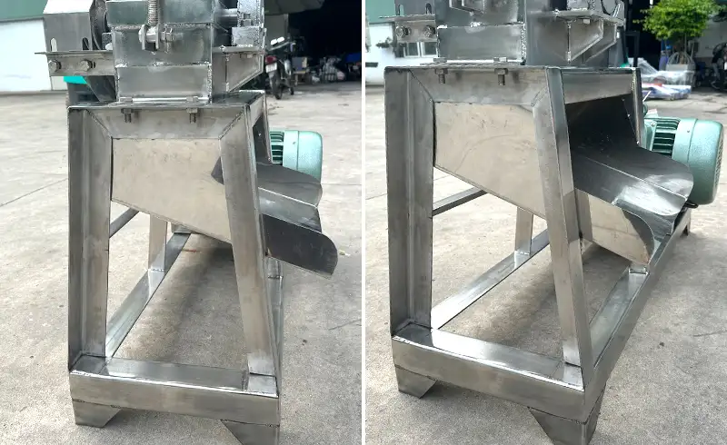 Thành phẩm sau khi nghiền được đưa trực tiếp ra ngoài cửa xả. Phía trước cửa xả thiết kế dốc thẳng xuống phía dưới, giúp nguyên liệu được xả ra ngoài dễ dàng