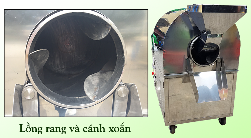 Lồng rang thiết kế to, rộng rãi kết hợp với các cánh xoắn chạy dọc có nhiệm vụ cuộn đảo đều nguyên liệu liên tục giúp hạt chín đều mà không lo bị cháy xém.