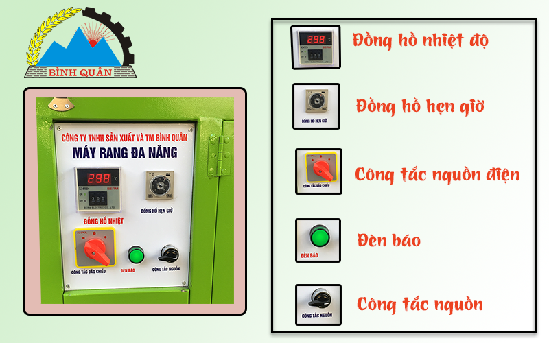 Đặc biệt, máy được trang bị bảng điều khiển thông minh, linh hoạt gồm công tắc tắt mở, công tắc đảo chiều, đèn báo hoạt động, đồng hồ hẹn giờ và đồng hồ nhiệt giúp người dùng dễ dàng theo dõi và điều chỉnh nhiệt độ phù hợp với từng nguyên liệu đem rang.