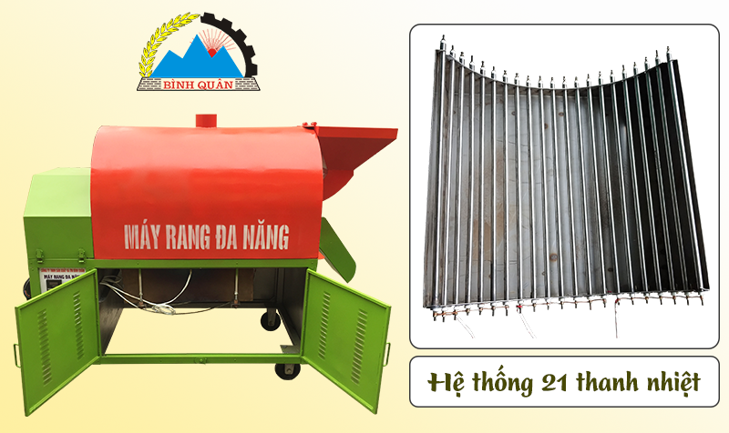 Máy được trang bị hệ thống 21 thanh nhiệt (mỗi thanh nhiệt 500-800W) xếp hình vòng cung chạy dọc đáy lồng rang, có nhiệm vụ cung cấp và duy trì nhiệt ổn định trong suốt quá trình rang chín hạt.