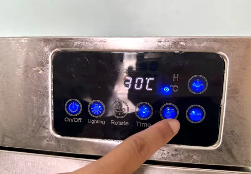 Khi tủ sấy được khởi động, hệ thống thanh nhiệt sẽ tạo ra lượng nhiệt nóng tối đa 90 độ C được hiển thị trên bảng điều khiển. Kết hợp với quạt gió ở phía sau sẽ thổi khí nóng tuần hoàn đi khắp các ngăn trong tủ tiếp xúc với bề mặt thực phẩm