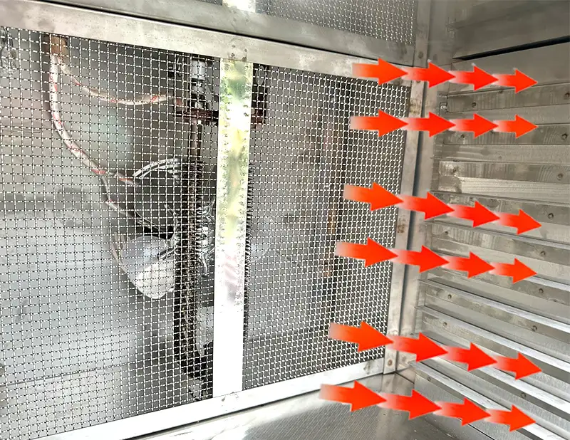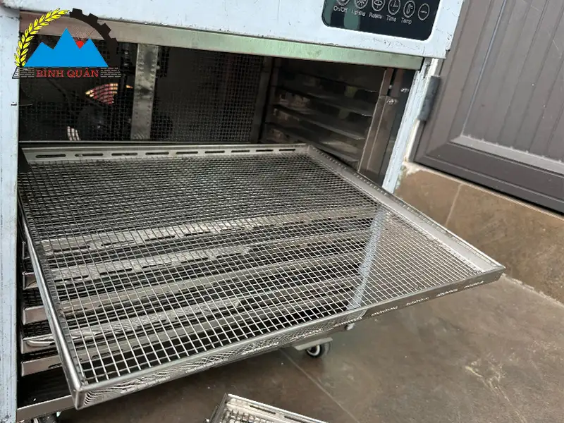 Bên trong khoang sấy khép kín với 10 tầng khay sấy dạng lưới kích cỡ 320*420mm, khoảng cách giữa các tầng khay sấy khoảng 3cm đảm bảo được hiệu quả sấy đều trên tất cả các khay