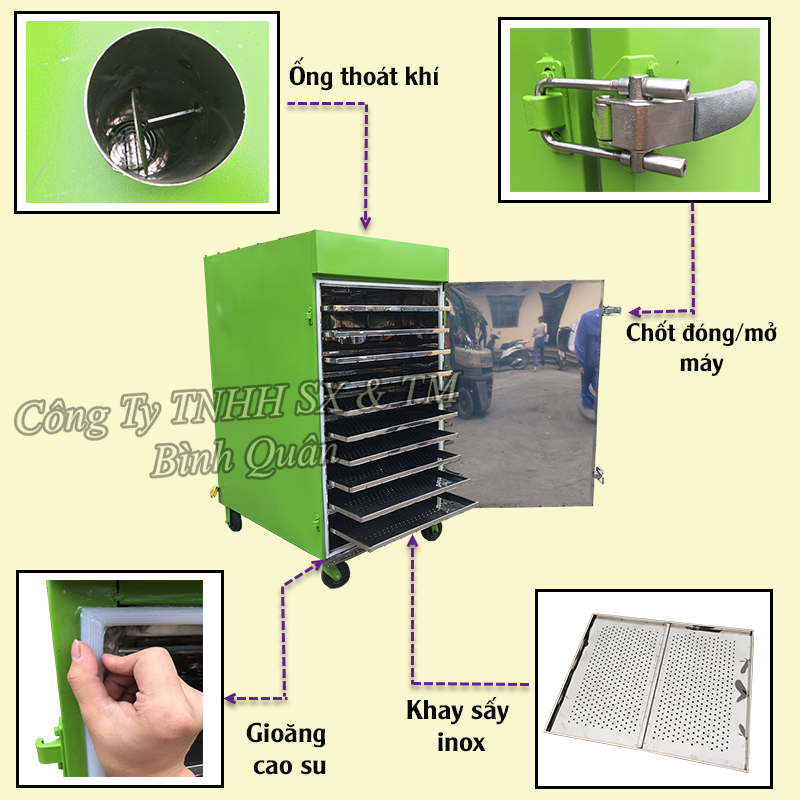 - Tính năng: Máy dùng để sấy khô các loại nguyên liệu như rau, hoa quả, thịt, cá... mà vẫn giữ nguyên được thành phần dinh dưỡng.