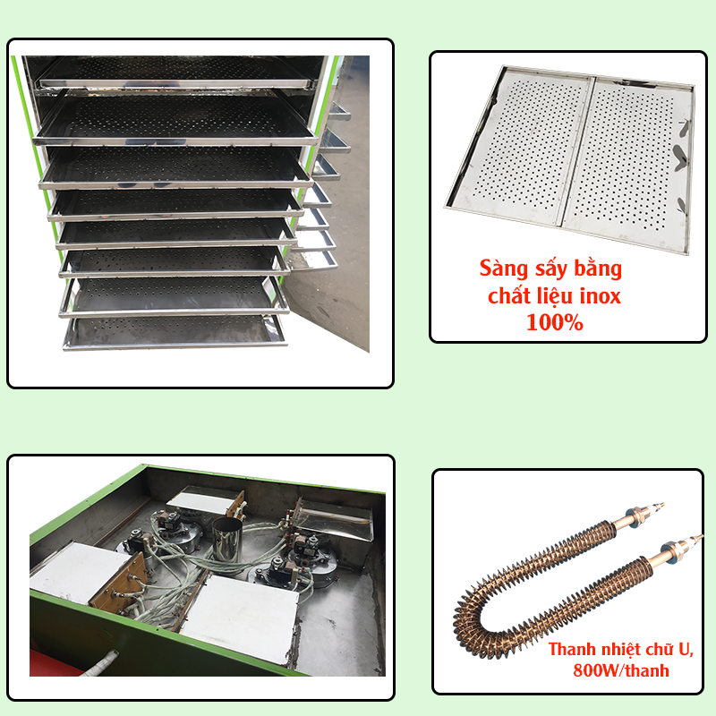 8 thanh nhiệt trong máy có tác dụng tỏa nhiệt và sấy đều nguyên liệu trong thời gian ngắn, công suất tiêu thụ nhiệt của mỗi thanh nhiệt 800W/1 thanh nhiệt.