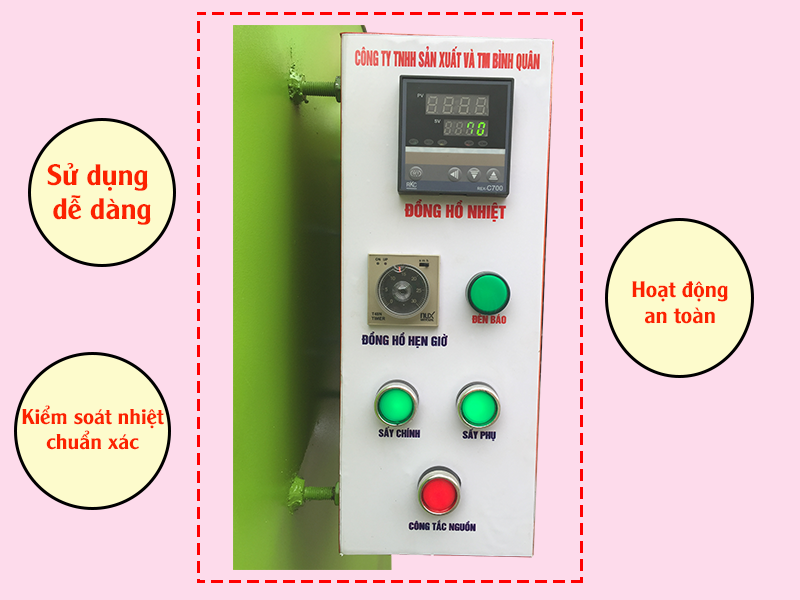 Máy sấy thực phẩm đa năng Bình Quân cùng hệ thống điều khiển nhiệt tiện ích gồm những: công tắc tắt/ mở, đồng hồ hẹn giờ, đồng hồ chỉnh nhiệt điện tử chuẩn xác. Ngoài ra được trang bị thêm hệ thống sấy chính và sấy phụ hỗ trợ cho việc giảm bớt lượng nhiệt quá cao không cần đến trong quá trình sấy khô thực phẩm.
