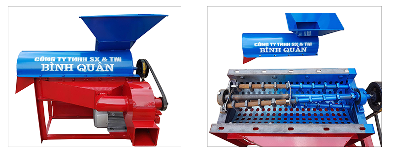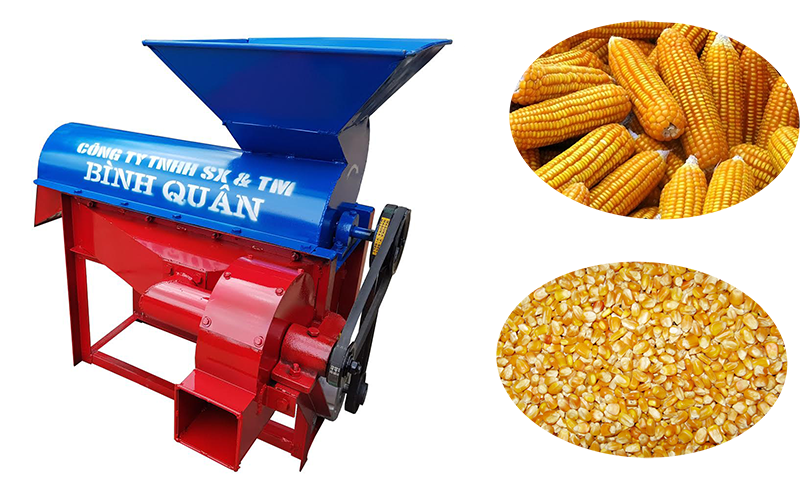 - Khởi động máy, bắp ngô từ phễu nạp sẽ được đẩy xuống buồng làm việc. dưới tác động của động cơ điện, trục chính quay tròn dưới sự truyền lực của mô tơ qua dây đai. Tại đây, bắp ngô sẽ bị kẹp giữa các thanh trục, hạt ngô được tách ra khỏi lõi, thổi sạch mày ngô.