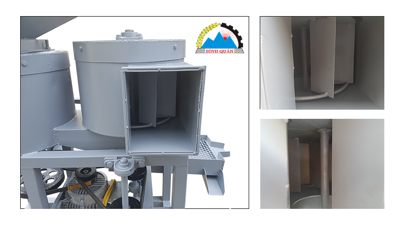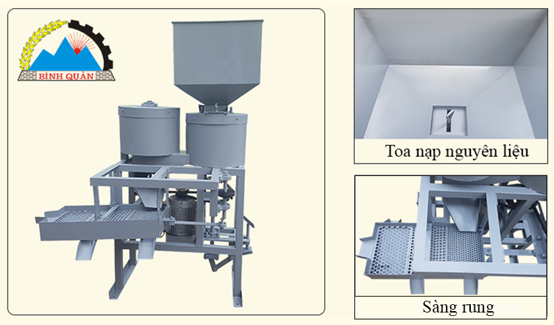 Máy được thiết kế toa nạp rộng rãi, có chốt điều chỉnh lượng nguyên liệu đi xuống buồng làm việc. Tại đây, lồng tách quay tròn tạo ra ma sát ép hạt với thành máy làm vỡ vỏ, đẩy hạt và vỏ ra ngoài theo hai đường riêng.