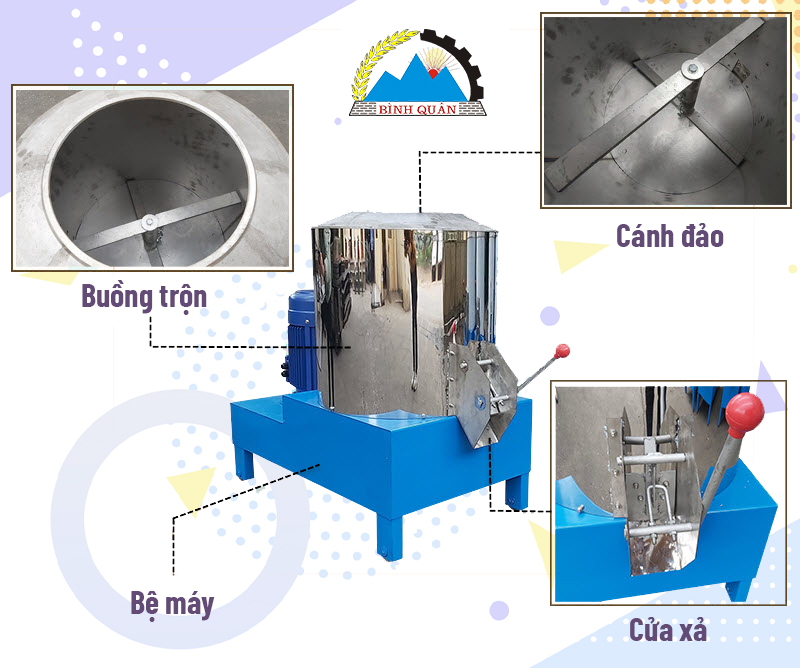 - Tính năng : Máy dùng để trộn các loại bột, cám thành hỗn hợp khô hoặc ẩm đồng đều.