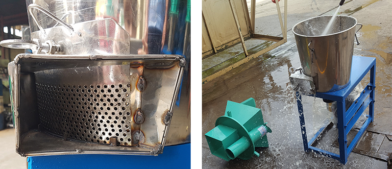 Máng nguyên liệu được gắn với thân máy bằng các chốt đóng giúp nguyên liệu không bị bắn ra ngoài khi máy hoạt động, bảo đảm an toàn cho người sử dụng. Máy được thiết 2 cửa nạp nguyên liệu to-nhỏ, phù hợp với các sản phẩm đầu vào. Khung máy chắc chắn, hạn chế rung khi vận hành. Điện năng 220V cùng công suất 2.2kW, cho năng suất 50-60kg/h, phù hợp với các gia đình kinh doanh nhỏ lẻ.